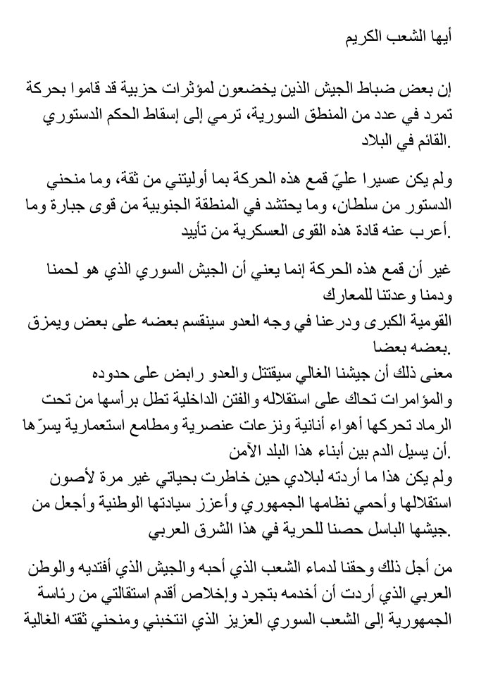 However, suppressing this movement would have meant dividing and tearing apart the Syrian Army; our flesh and blood; our asset for the ultimate national battle; and our shield against the enemy. It would have meant infighting within our cherished army when the enemy is at our doorstep and plots are being hatched against our independence. Sedition is being revived, driven by selfish whims, racist inclinations and colonial ambitions that would thrive on the bloodshed of the people of this safe country.