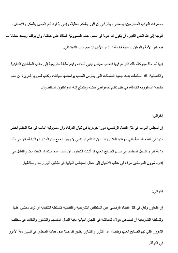 Honorable Representatives, I am delighted and honored to have won your valued trust, for which I am most grateful. I pray to God Almighty to give us the strength to assume the great responsibilities that are laid upon us, and to guide us through the path of serving the best interest of our nation and homeland under the leadership of the first President of the Republic, his excellency Adib Shishakli.