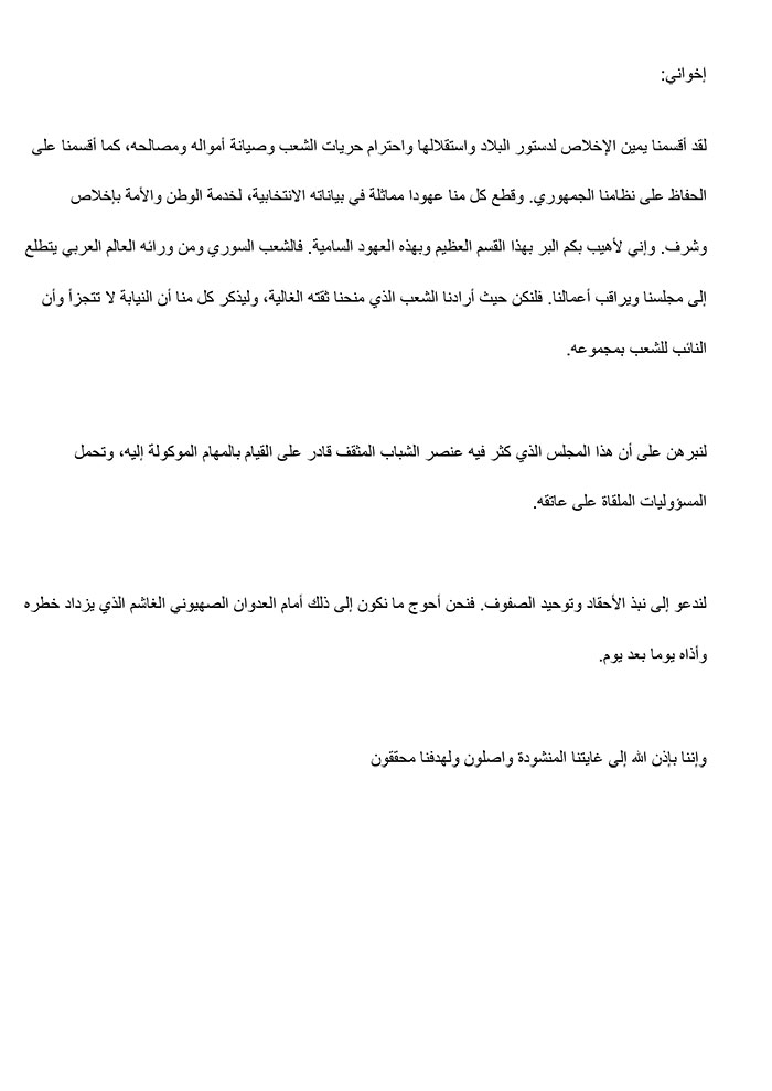 The Syrian people, and the wider Arab Nation, are looking forward to our House and monitoring our proceedings. let us be where the people who put their valued trust in us want us to be; let us keep in mind that a parliamentary seat cannot be divided, and that every member of parliament should represent the whole people.