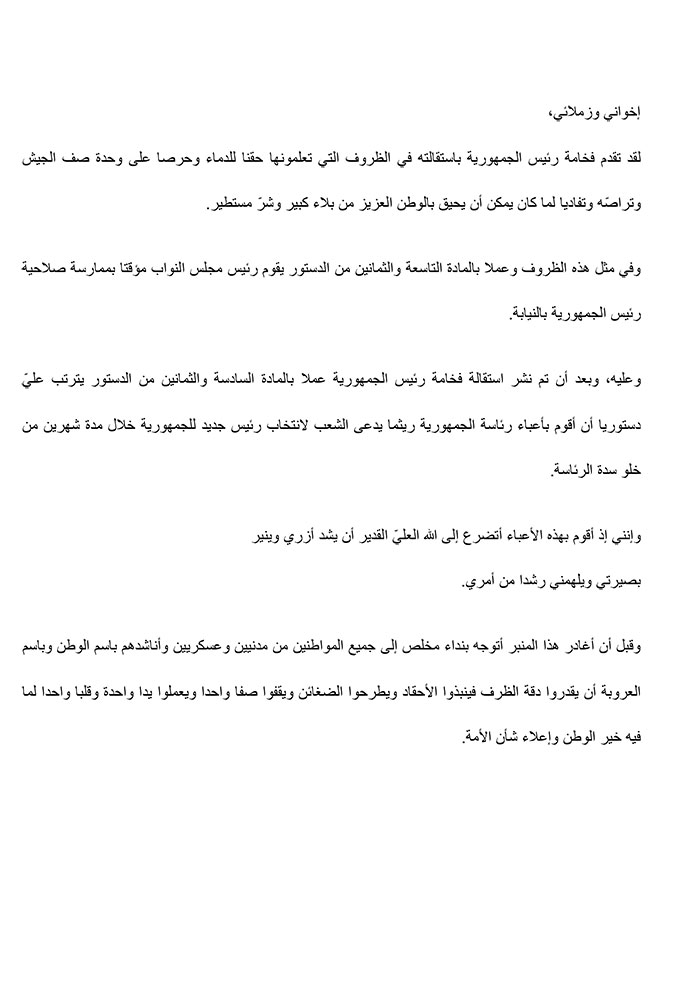 His Excellency, the President of the Syrian Arab Republic, has submitted his resignation, considering the circumstances that we are all aware of, to avert bloodshed, maintain the unity and coherence of the army, and protect our beloved country from the disastrous repercussions and great evil.