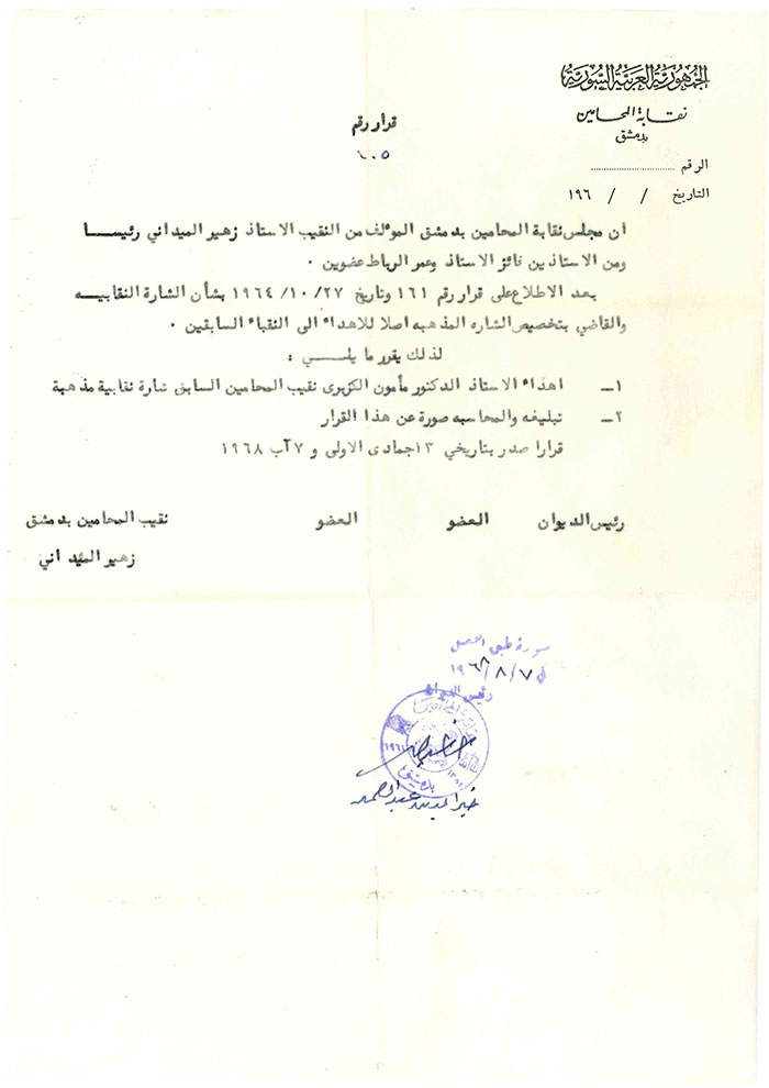 Letter from the Syrian Bar Association awarding Mamoun Kuzbari a decoration - 07 August 1968