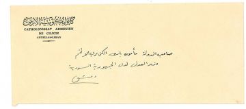 Letter from the Head of the Armenian Catholic Church Zareh I congratulating Mamoun Kuzbari on his appointment as Minister of Justice - 21 May 1957