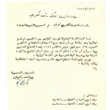 Letter from Akram Al Hawrani, Vice President to Mamoun Kuzbari, then Minister of Justice - 23 June 1959