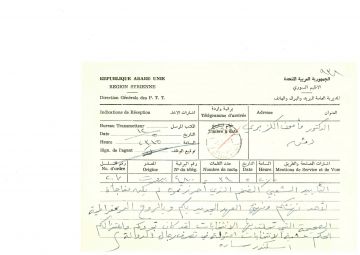 Telegram from the Catholic Church congratulating Mamoun Kuzbari on his electoral victory - 05 December 1961