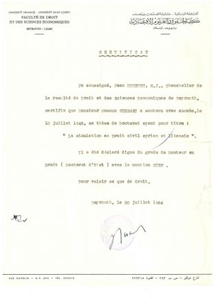 Letter from Jean Ducruet confirming Mamoun Kuzbari's PhD from the University of Saint Joseph - 30 July 1964