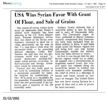 USA Wins Syrian Favor With Grant Of Flour, and Sale of Grains - 01/12/1961