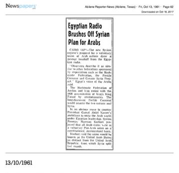 Egyptian Radio Brushes Off Syrian Plan for Arabs - 13/10/1961